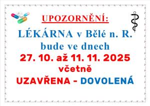 LÉKÁRNA v Bělé n. R. bude ve dnech 27. 10. až 11. 11. 2025 včetně UZAVŘENA - DOVOLENÁ