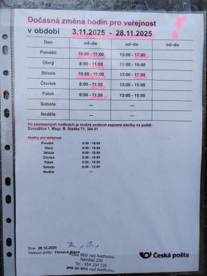 Česká pošta Bělá n. R. – dočasná změna pracovní doby v období 3. – 28. 11. 2025: Pondělí, středa 10:00 – 11:00, 13:00 – 17:00 h., úterý, čtvrtek, pátek 8:00 – 11:00, 13:00 – 15:00 h.