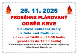 PLÁNOVANÝ ODBĚR KRVE v budově Základní školy v Bělé nad Radbuzou v čase od 14:00 do 16:30 hodin (prvodárci do 15:30 hodin). K odběru potřebujete kartičku Vaší zdravotní pojišťovny a legitimaci dárce krve.