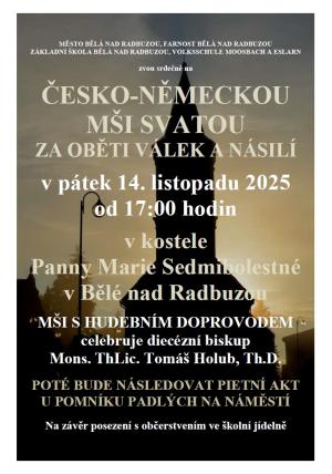 V kostele Panny Marie Sedmibolestné v Bělé nad Radbuzou. MŠI S HUDEBNÍM DOPROVODEM celebruje diecézní biskup Mons. ThLic. Tomáš Holub, Th.D., POTÉ BUDE NÁSLEDOVAT PIETNÍ AKT U POMNÍKU PADLÝCH NA NÁMĚSTÍ. Na závěr posezení s občerstvením ve školní jídelně