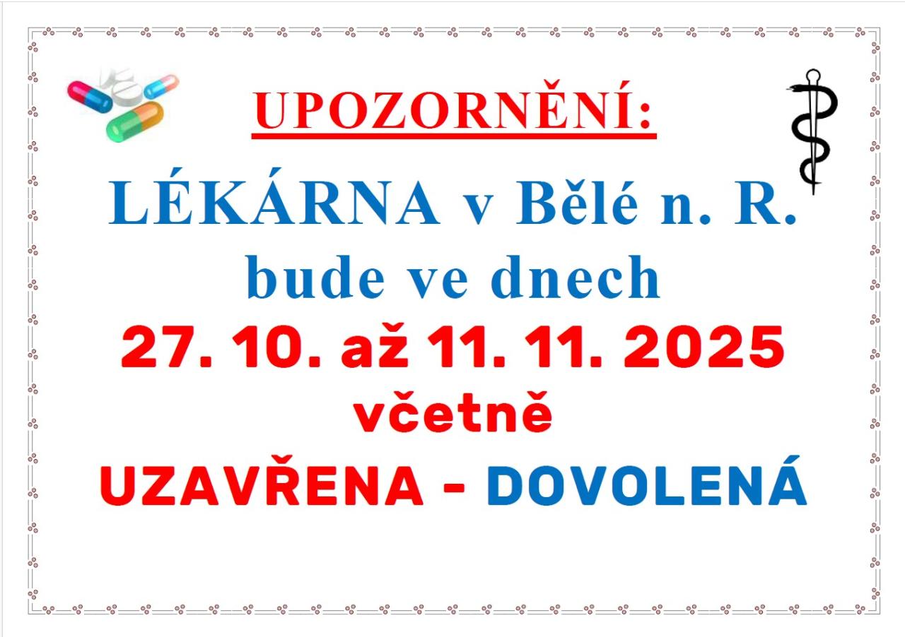 LÉKÁRNA v Bělé n. R. bude ve dnech 27. 10. až 11. 11. 2025 včetně UZAVŘENA - DOVOLENÁ