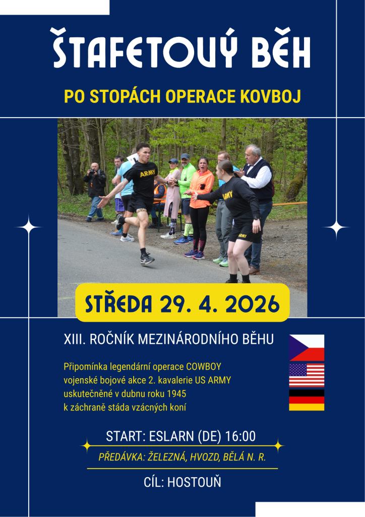XIII. ročník mezinárodního běhu připomíná legendární operaci Kovboj, která se uskutečnila v dubnu roku 1945. Tento běh je vzpomínkou na vojenskou akci 2. kavalerie US Army, která se zaměřila na záchranu stáda vzácných koní. Akce se koná ve středu 29. dubna 2026, start je v Eslarnu v 16:00. Závodníci se poté přesunou přes předávky v Železné, Hvozdu a Bělé nad Radbuzou, až do cíle v Hostouni.