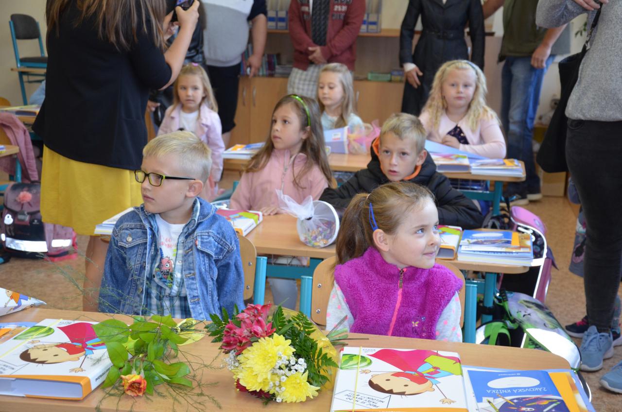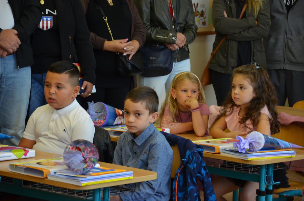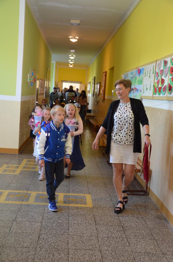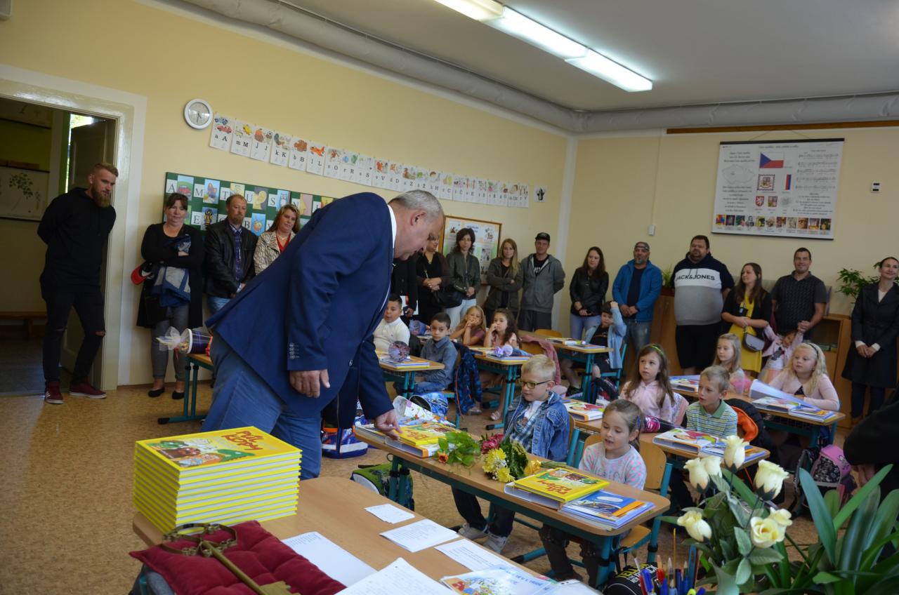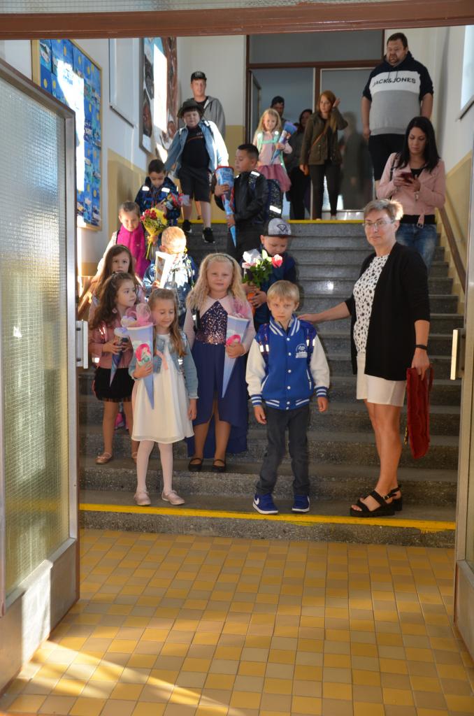 Zahájení prvního školního dne před budovou ZŠ v Bělé nad Radbuzou